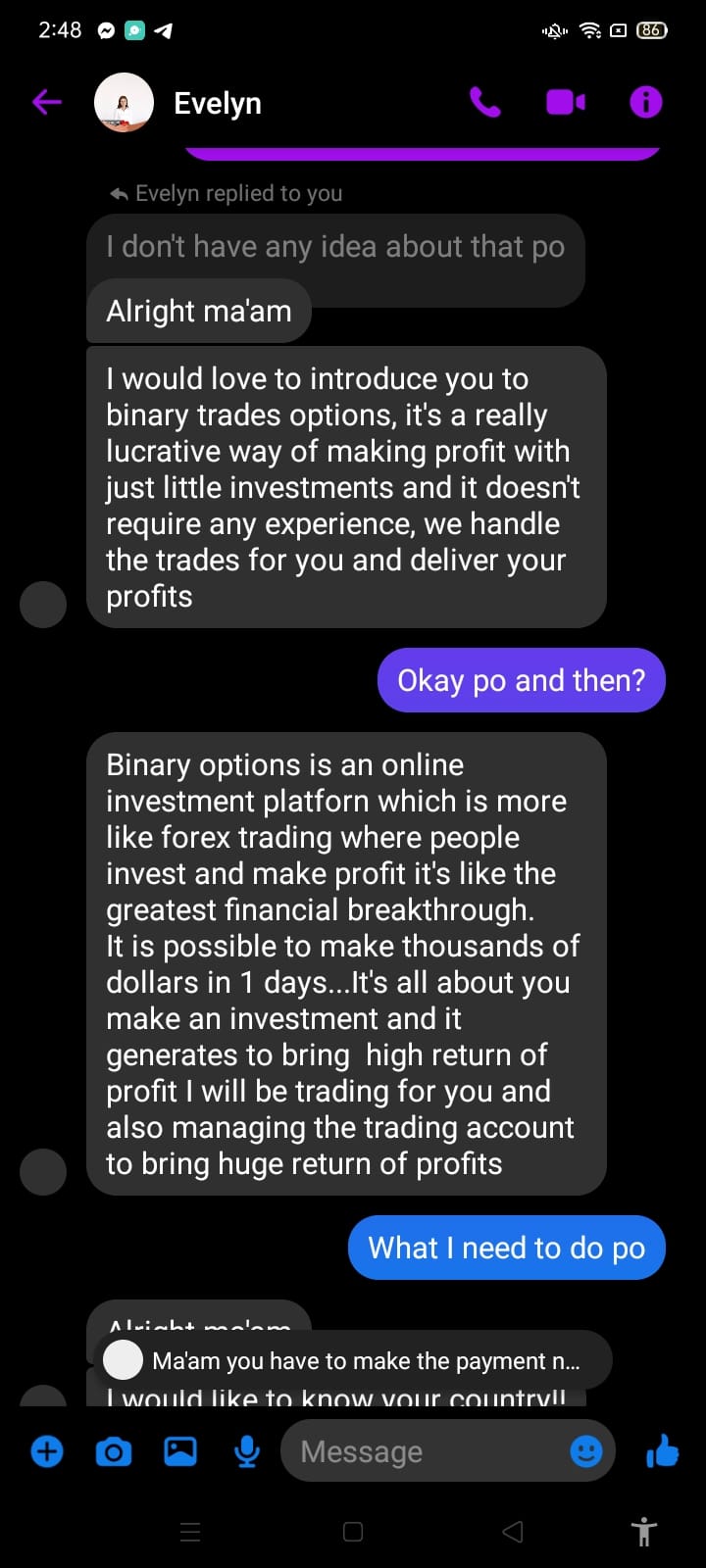 Scammers often reach out with enticing promises of lucrative profits through binary options trading, claiming to handle the trades and deliver profits on behalf of the individual.